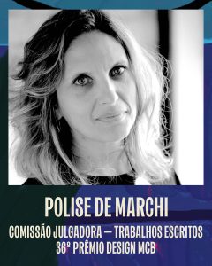 MIni-bio – Doutora em Educação, Arte e História da Cultura (Mackenzie, 2014), mestre em Comunicação (UNIP, 2002) e Design (Belas Artes, 1986). Docente do Belas Artes-SP (graduação, pós e mestrado). Atua em história do design, visual merchandising/experiência, arte e moda, cenografia e sustentabilidade. Autora de 4 livros. Vice-presidente acadêmica da ABD. Cofundadora da Casapobox (prêmios 2018/2019/2021). Podcaster (Giropobox; Sardinhas do Design).