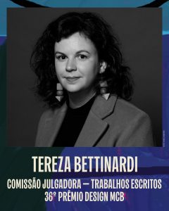 Designer e editora que vive e trabalha em São Paulo, Brasil. É graduada em Desenho Industrial/Programação Visual pela Universidade Federal de Santa Maria. Desde 2014 trabalha em seu próprio estúdio, desenvolvendo projetos em diferentes campos do design, incluindo editorial, identidade visual, embalagem e design de exposições. Tereza é autora do capítulo “Bea Feitler: The Sir to Ms. Years,” publicado em Baseline Shift: Untold Stories of Women in Graphic Design History (Princeton Architectural Press, 2021). Em 2020, Em 2022, foi eleita uma das 30 vozes pela lista Papel & Caneta como criadora de uma das iniciativas que lutaram para mudar o mercado criativo com o Clube do Livro do Design, uma editora dedicada a expandir a oferta de escritos de design disponíveis em português.